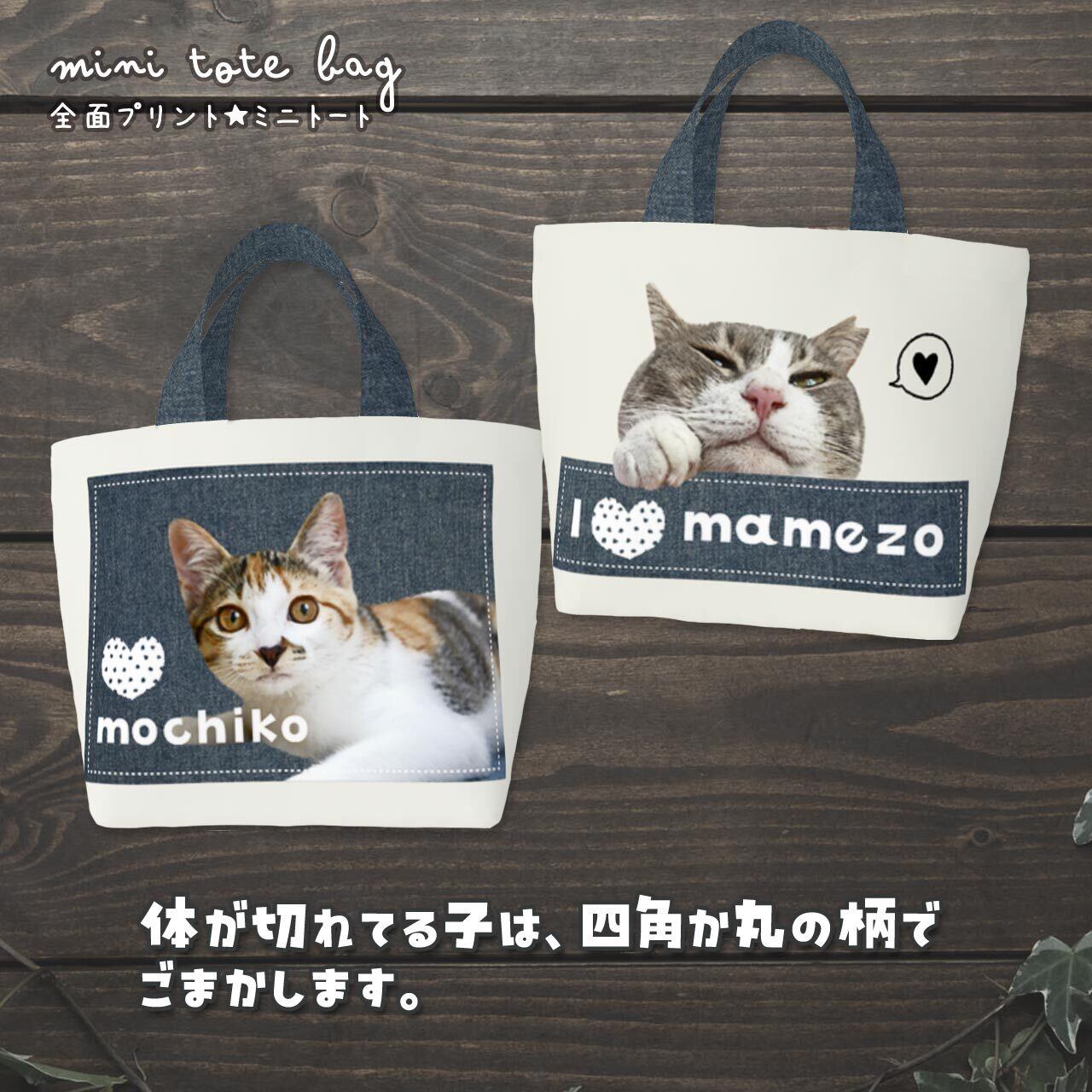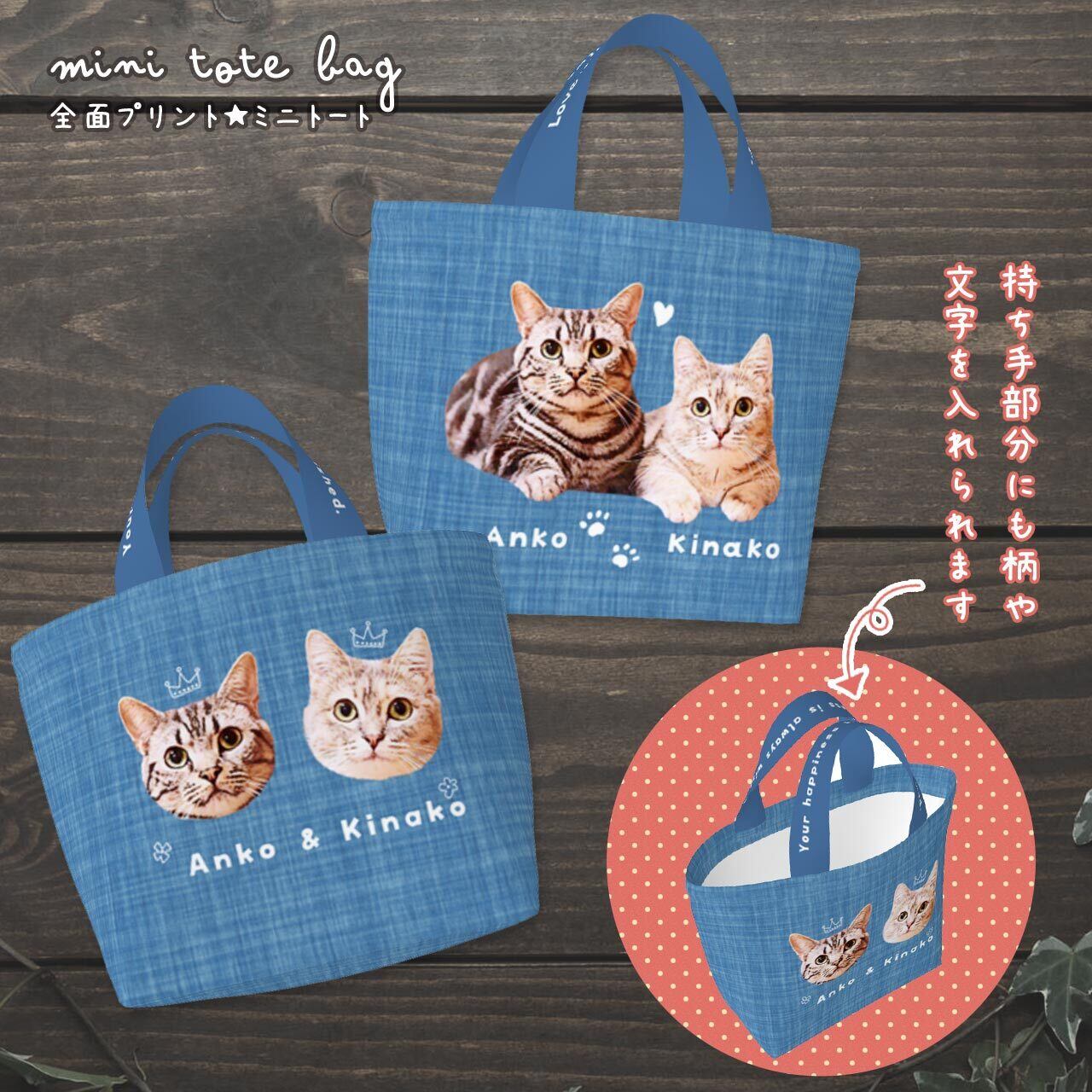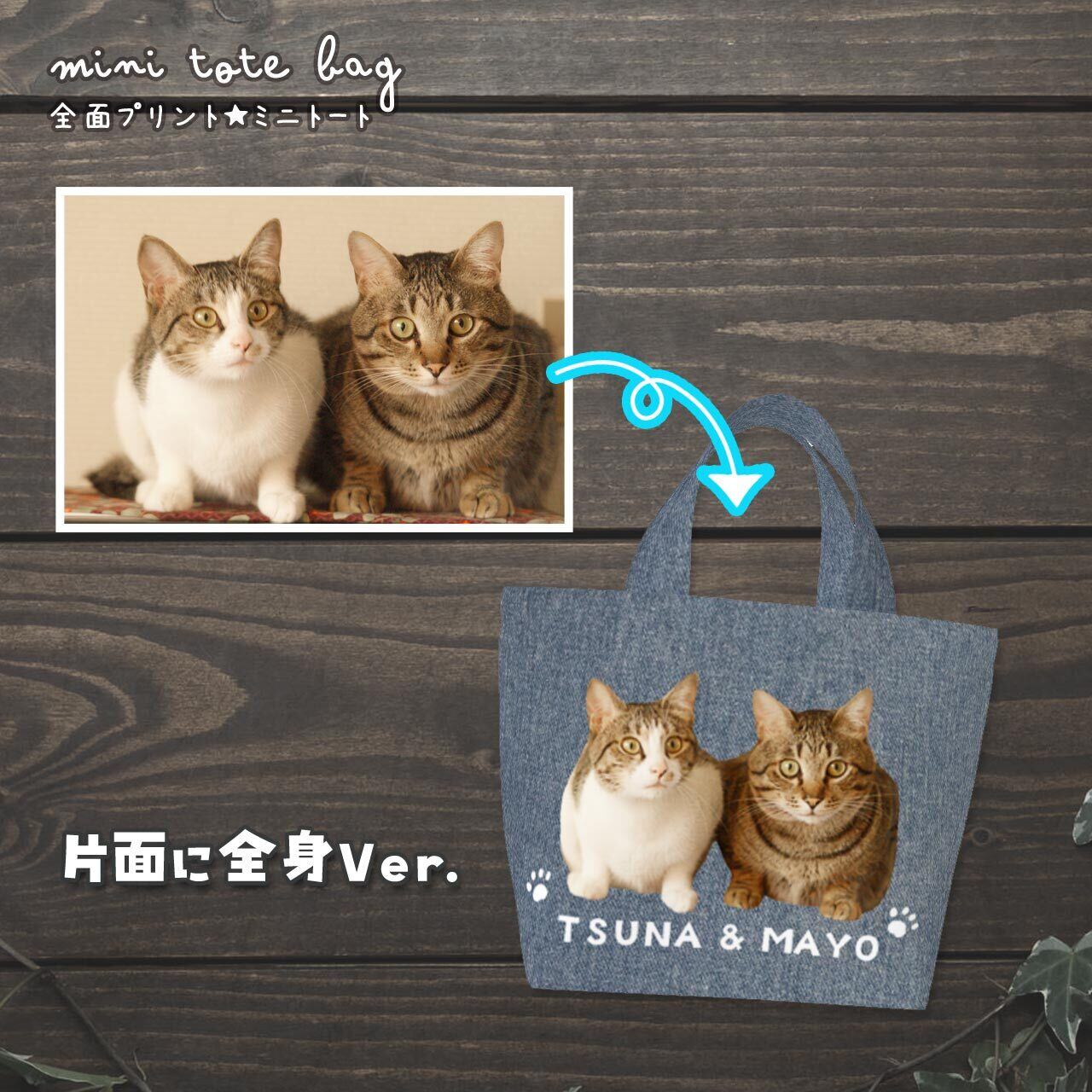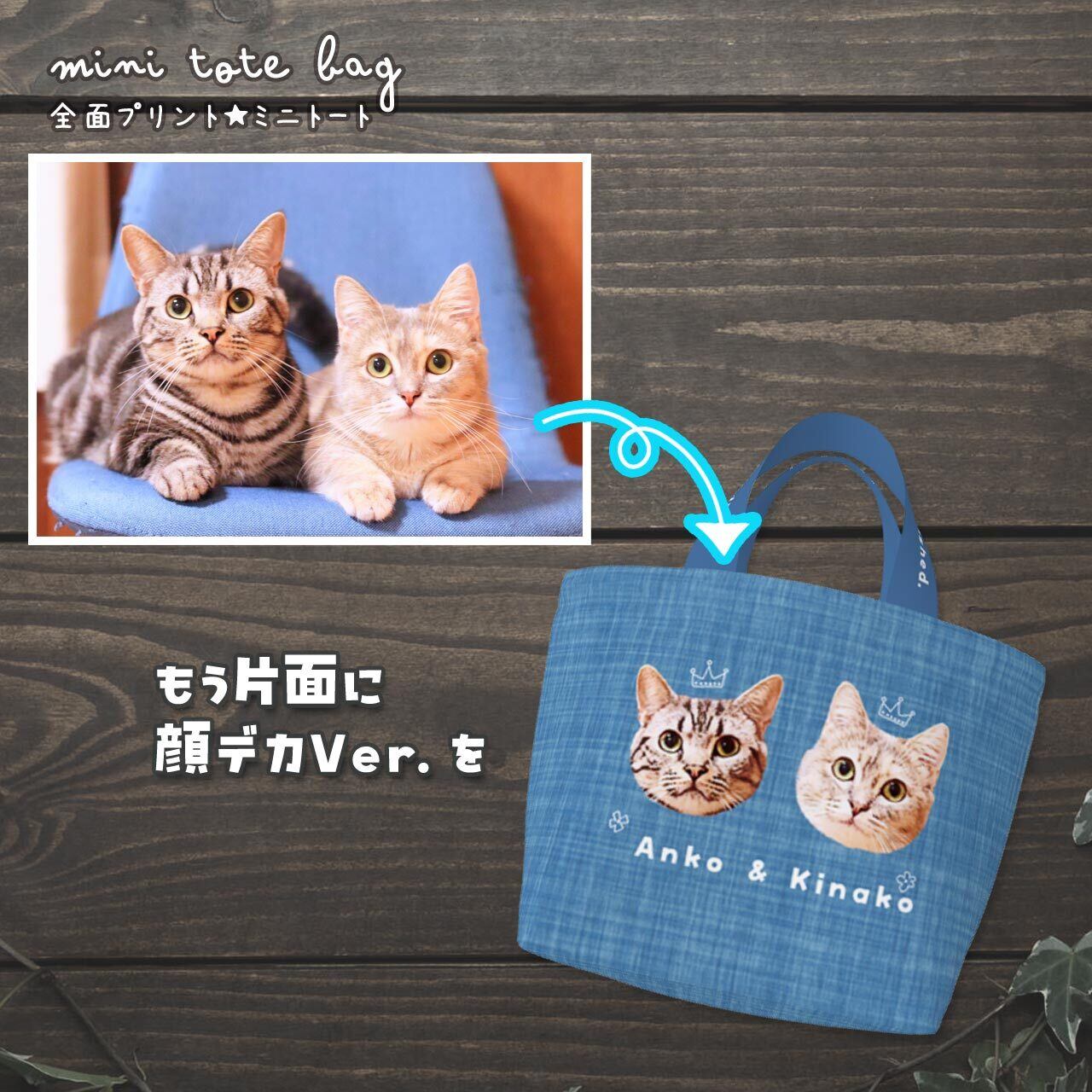 おうちの猫さん、または猫カフェなどで撮った猫さんの "お気に入り画像" を送っていただき、加工&切り抜きをし、ミニトートバッグの両面に印刷します(印刷会社に出します)。