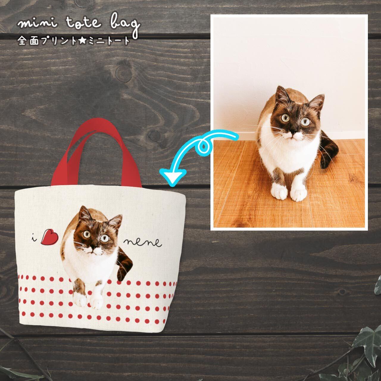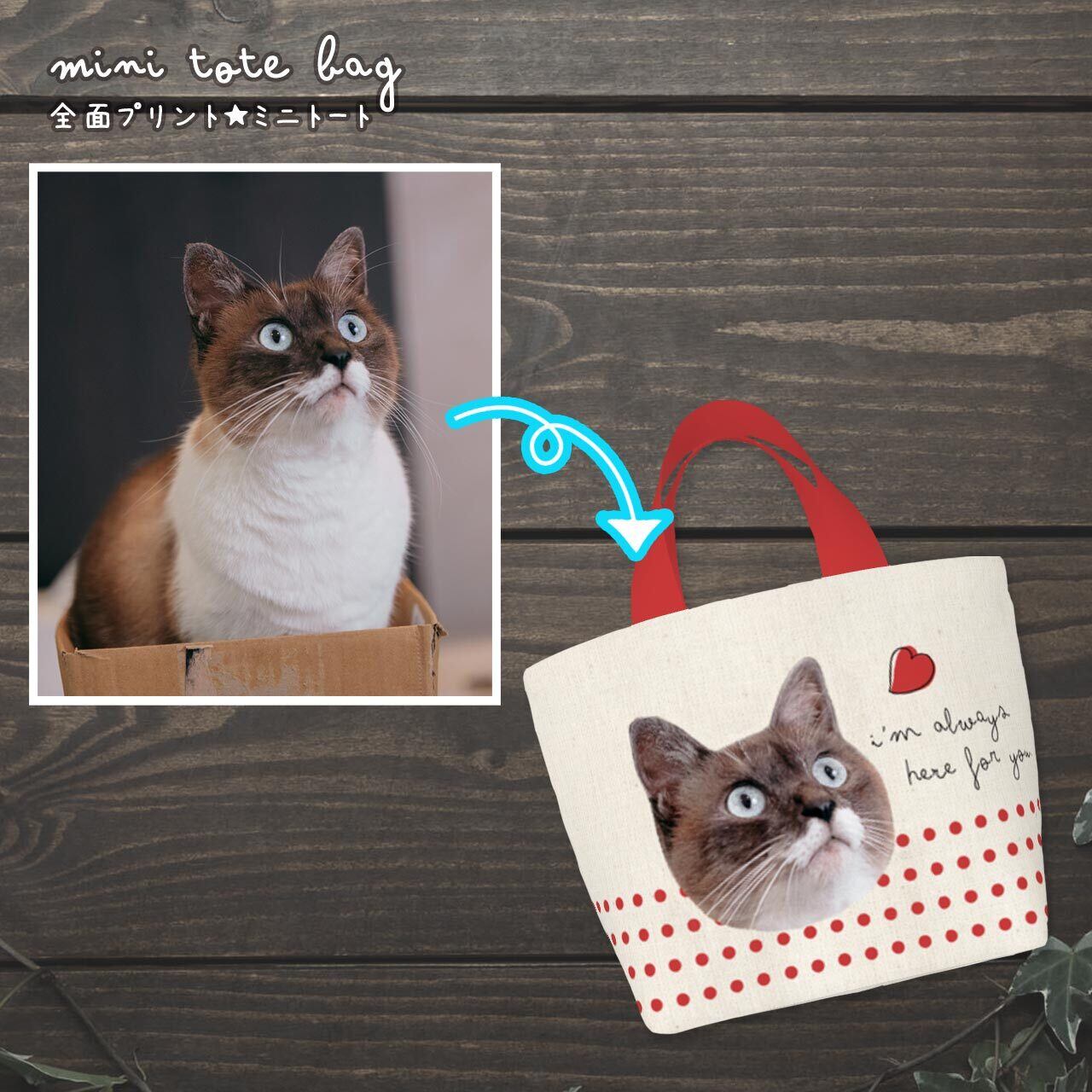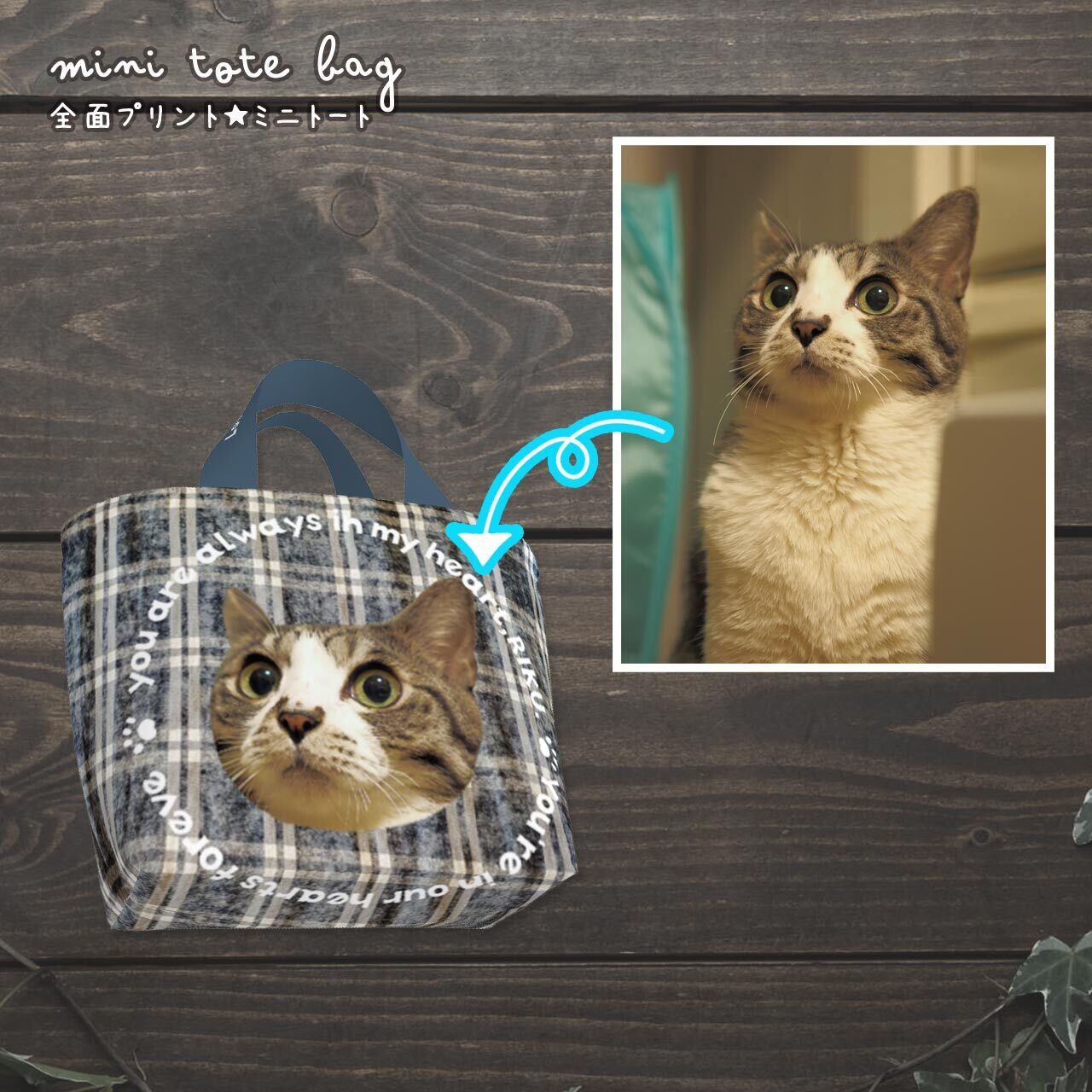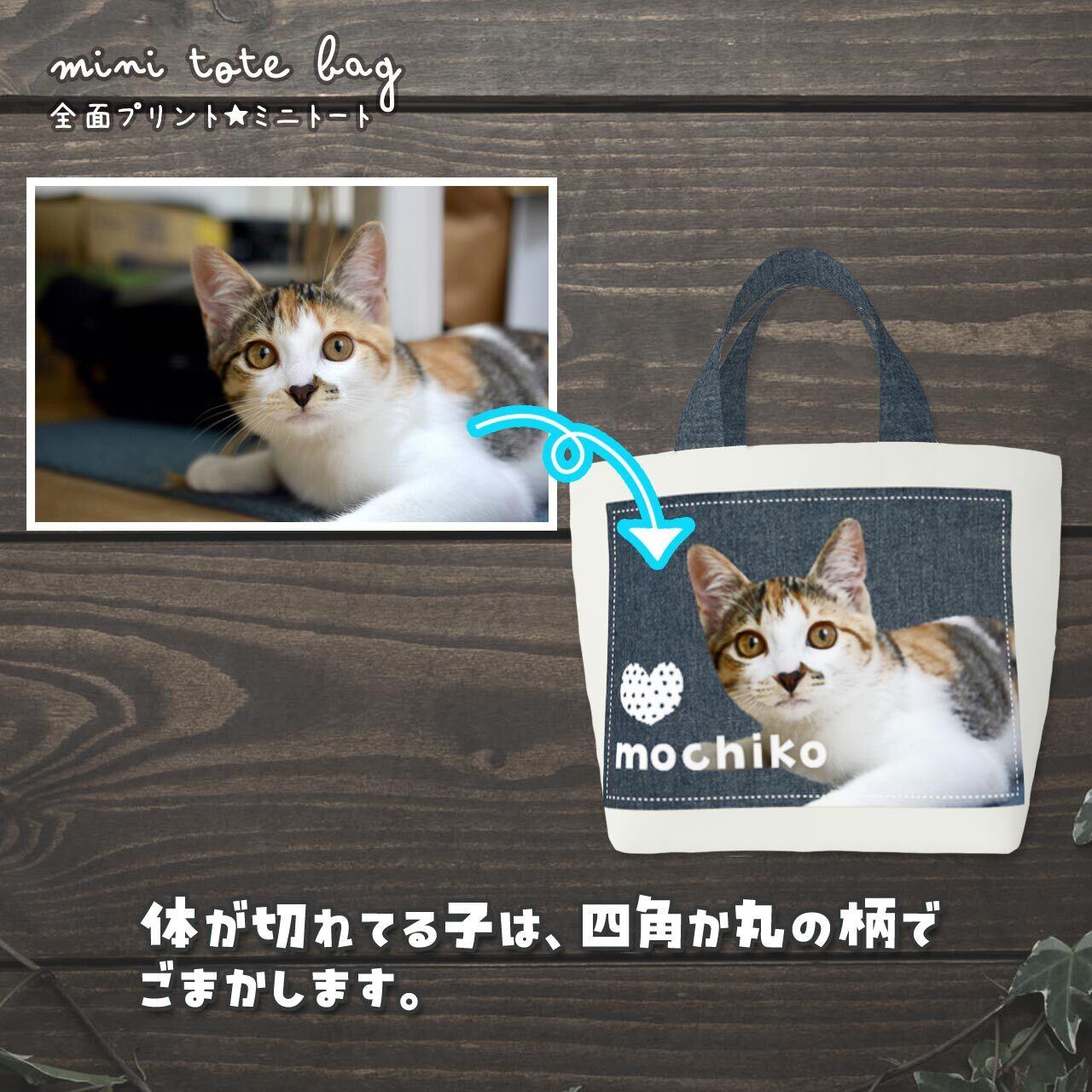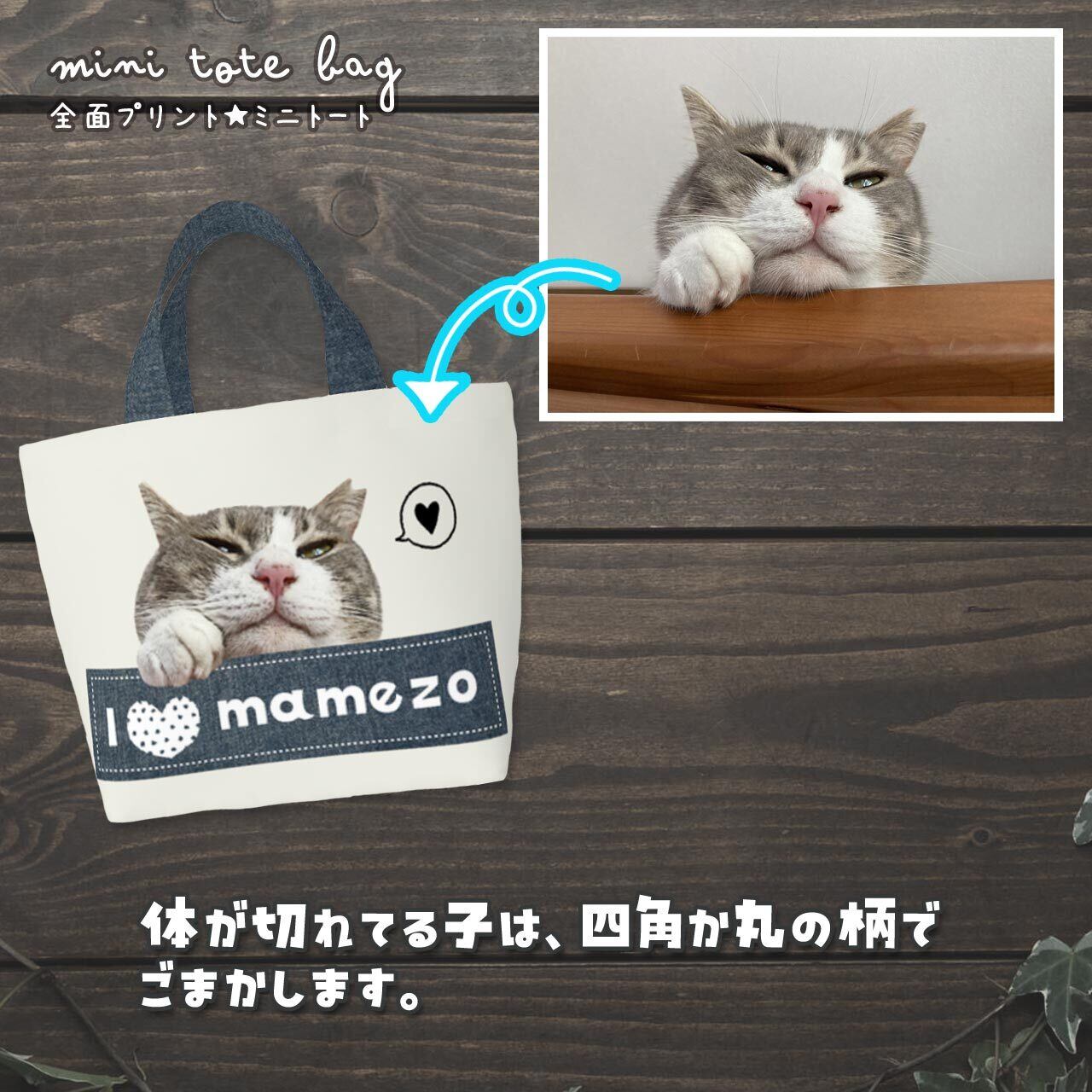 おうちの猫さん、または猫カフェなどで撮った猫さんの "お気に入り画像" を送っていただき、加工&切り抜きをし、ミニトートバッグの両面に印刷します(印刷会社に出します)。